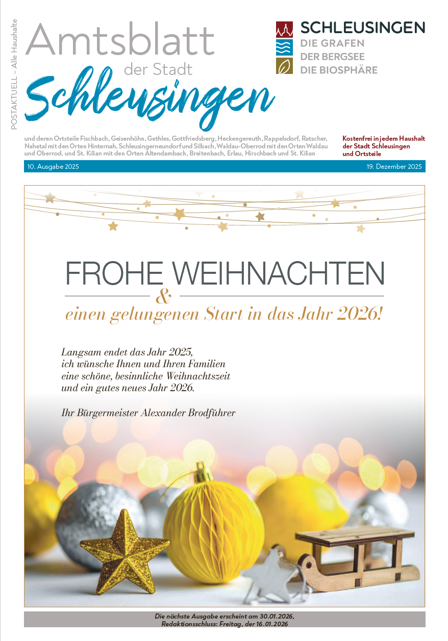 Amtsblatt Schleusingen 19.12.2025 Veröffentlicht am 19.12.2025 von Rathaus Schleusingen Amtsblatt Schleusingen 19.12.2025